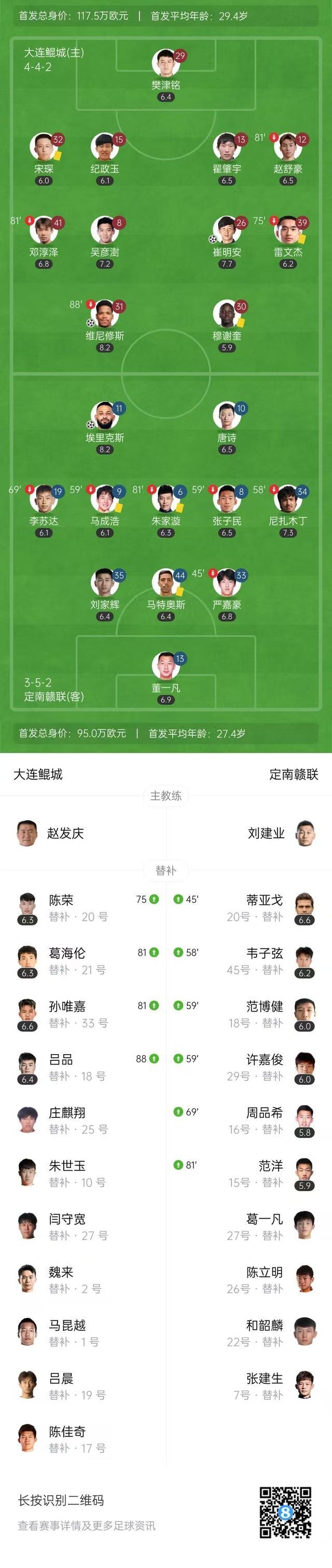 第45+2分钟,大连鲲城右路突破送出传中,维尼修斯头球破门,大连鲲城2-1定南赣联。↓
